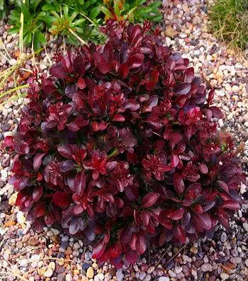 Унікальний, карликовий сорт барбарису кулястої форми, що завдяки розкішному листю здобув заслужену славу серед садівників. Листя цього сорту має насичений пурпурний, іноді з малиновим або цегляним відтінком колір. Крона куляста,округла, симетрична і компактна, листя ростуть дуже щільно, формуючи густі зарості (4-6 шт/м2). Нові листочки мають темно-рожевий колір, саме вони надають рослині такий відтінок - а в глибині ростуть більш зелені, з невеликим червонуватим нальотом. Восени всі вони стають яскраво-червоними, малиновими, бордовими. До грунту невимогливий. Стійкий до посухи. Добре стрижеться та переносить обрізку. Не замінний при створенні композицій, бордюрів і живих огорож, що виглядають просто заворожуюче. Хороший сорт і в одиночній посадці в різних ділянках саду.Н: 0,4 м, d-0,4 м