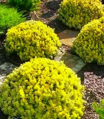 Один з найменших і повільноростучих сортів з компактною, кулястою формою крони. Сферичну форму зберігає без формуючої обрізки. Цікавий завдяки золотисто-жовтим листям і жовтим квітами, що розпускаються в травні. До грунту невимогливий. Стійкий до посухи. Морозостійкий. Відмінний для посадки в бордюрах, альпінаріях, кам'янистих садах, низькорослих групах, як солітер. Посадка 4-6 шт./м2.Н: 0,3-0,4 м, d-0,4-0,5 м.
