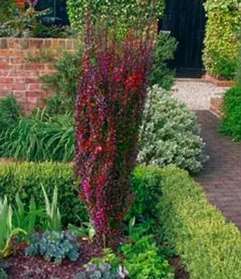 Декоративний, листопадний сорт з вертикально зростаючими пагонами. Має невеликі, гладкі, округлі, злегка звужені до основи листя червоного кольору, що набувають помаранчевого відтінку ближче до осені. Квітне в травні яскраво-жовтими квітками, у великих гроноподібних суцвіттях. Плоди великі, їстівні, оранжевого забарвлення. В тіні листя втрачає свій колір і стає зеленішим. Росте на будь-яких грунтах, до того ж виносить застій вологи. Морозостійкий. Застосовується для живих високих живоплотів, для декоративних композицій, в одиночних і групових посадках (2-3 шт/м2). Добре піддається стрижці.Н: 1,5-1,7 м, d-1,0 м