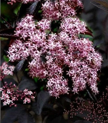 Надзвичайно ефектний, швидкоростучий кущ, завдяки темно пурпуровому (восени-червоному) листю, та запашним, ніжно-рожевим, зібраним у великі суцвіття (до 15 см в діаметрі) квітам. Ягоди фіолетово-чорні, їстівні. Надає первагу родючим, вологим ділянкам. Зимостійкий. Прекрасно поєднюється в композиціях як в квіткові міксбордери, так і з деревами та кущами.Н: 2,5-3,0 м, d-3,0-3,5 м