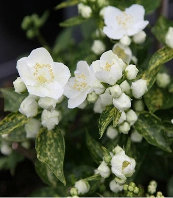 Густо розгалужений компактний сорт, родзинкою якого є темно-зелені з жовтими і кремовими полосками і крапочками листя. Квіти поодиночні, напівмахрові білі, з приємним ароматом, з'єднані по 5-7 шт в суцвітті. Сорт ідеальний для використання в саді із-за декоративності листя і рясного ароматного цвітіння. Не вимогливий. Потребує регулярної обрізки.Н: 1,5-2,0 м, d-1,5 м