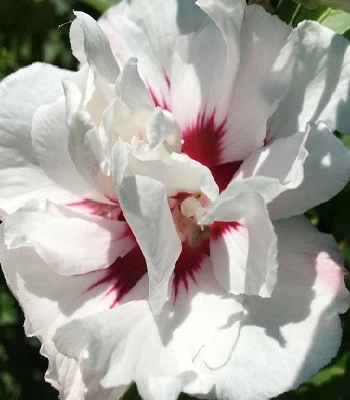Відрізняється неймовірною красою, невибагливістю і витривалістю. Дуже ефектний і красивий сорт з махровими білосніжними квітами із невеликим бордовим червоним вічком в центрі, яке розходиться бордовими променями по всіх пелюстках. Листя зелене. Особливих вимог до грунту немає. Морозостійкий. Він вигідно виглядатиме на клумбах, прибудинкових ділянках, уздовж бордюрів і не тільки, в якості живоплоту, в одиночних і змішаних посадках.Н: 2,0-3,0 м, d-1,5-2,5 м