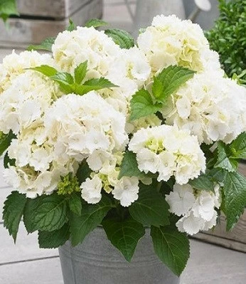 Один з кращих білосніжних сортів. Його кулясті, білосніжні, махрові суцвіття послужать чудовою прикрасою садової ділянки протягом всього літа. Великі до 20 см суцвіття на початку цвітіння білі з блакитним відтінком, а коли дозрівають - рожевіють. Листя велике темно-зелене. Віддає перевагу кислим, вологим, добре дренованим грунтам. Рекомендується укриття на зиму. Красиво виглядає як в одиночній посадці, так і в тінистих міксбордерах.Н: 1,2-1,5 м, d-1,2-1,5 м