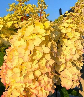 Цінний сорт, який рясно квітне на однорічних приростах. Суцвіття дуже великі до 20 см. За час тривалого цвітіння, колірна гамма квіток плавно змінюється. На початку цвітіння квіти жовто - зеленого кольору, потім колірна гамма поступово змінюється на кремового - білий з плавним переходом на кремово - золотистий колір. Квітне на пагонах поточного року. Листя темно - зелені, по краю зубчасті. Пагони сильні, у верхній частині фіолетові, що створює гарний контраст з пишними суцвіттями, які добре ростуть на напівтінистій або сонячній ділянці. Надають перевагу добре дренованому, помірно вологому грунту. Чудово виглядає в змішаних композиціях у поєднанні з іншими сортами. Яскраві суцвіття прекрасні для зрізання.Н: 1,0-1,5 м, d-1,0-1,5 м