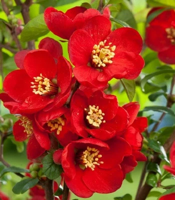 Хеномелес Crimson and Gold стані перлиною Вашої колекції декоративних рослин! Особливий за рахунок темно - червоних поодиноких квітів з виразними жовтими тичинками, які пізніше перетворюються в запашні їстівні плоди. Плоди яблоковидні (діаметр 5 см, вагою близько 40-80 г), зелені, пізніше жовті, дуже тверді і ароматні. Досить невибагливий і морозостійкий, проте не виносить засолення і кислих грунтів, краще росте, квітне і плодоносить лише на сонячних, захищених від вітру ділянках з родючим грунтом і достатнім поливом, особливо в літню спеку. Відмінно виглядає на альпійських гірках, а також як грунтопокривна рослина, для живоплоту. Плоди в свіжому вигляді вважаються аналогом лимона (їх так і називають «північний лимон») - стільки ж вітаміну С і при цьому вони мають ананасовий аромат. По - справжньому смачним виходить варення, повидло, цукати, мармелад. Посадка 1-2 шт/м2.Н: 1,0-1,2 м, d-1,0-1,2 м