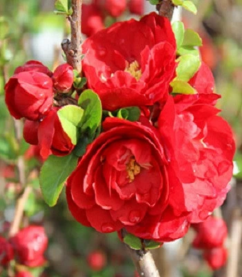 Новинка! Це один з кращих сортів японської айви. Він привертає махровими яскравими червоними квітами з золотими тичинками уздовж голих пагонів. Квіти розпускаються ще до появи листя. Листя темно - зелені, овальні, блискучі. Восени покривається жовто - золотистими плодами, а іноді, запізнілими квітками. Невимогливий, віддає перевагу сонячним ділянкам. Чудово виглядає в одиночних і групових посадках, в живоплотах і в шпалерах. З плодів варять дуже смачне варення, роблять цукати і компоти. Посадка 1 шт/м2.Н: 1,2-1,5 м, d-1,5 м.