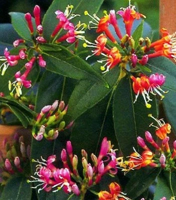 Відноситься до напіввічнозелених витких або сланких рослин і славиться своїми яскравими зеленими листками, які дивовижно прикрашають навіть, найбільш непривабливі ділянки в саду. Листя ланцетні, до 10 см завдовжки, темні і шкірясті. У період цвітіння розпускається безліч ароматних, трубчастих, яскраво-рожевих або коричнево-червоних квіток, які попарно збираються в рідкісні суцвіття. Плоди дозрівають у вересні-жовтні і являють собою декоративні пурпурно-чорні ягоди, які щільно притискаються до листя. Невибаглива. Добре переносить недолік сонячного світла. Краще росте на захищеній від вітру ділянці. Чудова у вертикальному озелененні терас, балконів, альтанок, а також як грунтопокривна рослина.Н-3,0-6,0 м.