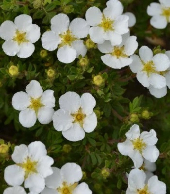 Сорт з щільною, широкою, подушковидною кроною. Пагони розташовані вертикально, нижні звисаючи, утворюють шлейф. Листя світло-зелені. Квіти білі, розкриваються в червні і зберігаються на кущах до кінця вересня. Помірно вимогливий до води і родючості грунту, але краще розвивається на родючому. Ідеальний в одиночних і групових посадок на газоні. Добре переносить стрижку і довго зберігає декоративний компактний вид.Н:1,0-1,2 м, d 1,0-1,3 м.