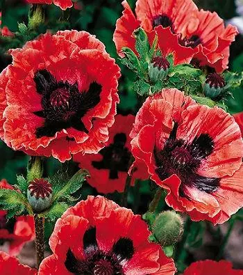 Дивовижний сорт з прямостоячими стеблами увінчаними чашоподібними, широко розкритими, великими квітками - до 20 см в діаметрі. Квіти криваво-червоні з чотирма великими чорними плямами і чорними тичинками. Квітне на протязі 30 днів в середині травня - середині червня. Листя великі, перисторозсічені, зелені з сріблястими ворсинками, зібрані в прикореневу розетку. Після цвітіння надземна частина повністю відмирає, нові пагони з'являються у вересні. Віддає перевагу звичайному добре дренованому грунту. Морозостійкий.Н: 0,9-1,2 м, d-0,3 м