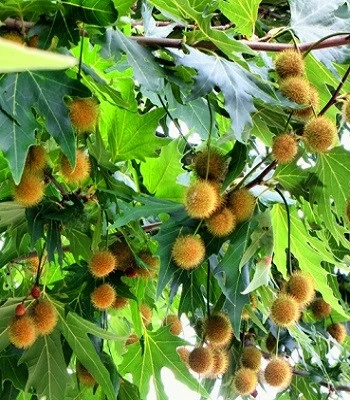 Дерево з розкидистою кроною і оригінальною відшаруватою пластинами корою. Стара сіра кора опадає пластинами, а молода має світло-зелене забарвлення, в зв'язку з чим стовбур виглядає плямистим. Найчастіше його називають "східним кленом" - за схожість листя, але у клена листочки 5-6 см, а у нього - 25 см. Листя осінню коричнево - зелені. Декоративності додають екзотичні плоди, що висять на довгих плодоніжках і зберігаються на дереві до весни. Віддає перевагу сонячним і теплим ділянкам і родючим грунтам. Добре переносить обрізку.Н: 10,0 м.