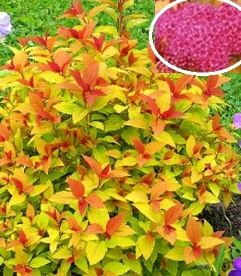 Володарка оригінального забарвлення листя і яскравого цвітіння, які чудово доповнюють один одного. Особливістю є поступова зміна листя від яскраво-червоного у молодих листків, до помаранчевого і жовтого, створюючи при цьому дуже цікавий декоративний ефект. Квіти рожеві з фіолетовим відтінком, зібрані в щитковидні суцвіття до 5 см в діаметрі. З'являються на кущах наприкінці червня. Віддає перевагу добре дренованому, зволоженому, родючому грунту. На затінених ділянках втрачає насиченість забарвлення. Відмінна для одиночних і групових посадок, при створенні низьких бордюрів. Підходить для вирощування в горщику і як грунтопокривна рослина.Н: 0,5 м, d 1,0 м.