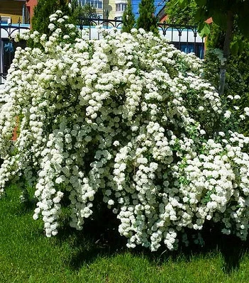 Хочете, щоб у вас на початку літа трапилося чудо - зелений кущ раптом покрився квітковим снігом? Під час цвітіння цей сорт нагадує пагорб, повністю покритий снігом - білосніжним, пухнастим, легким. Густа крона формується з прямостоячих скелетних шоколадного кольору пагонів, вершини яких витончено нахиляються. Білі, щитковидні суцвіття повністю покривають пагони куща. Листя синювато - зелені, шкірясті, подовжені. Росте на будь яких садових грунтах, але надає перевагу родючим і вологим. Відмінно прикрасить будь-яку ділянку за рахунок своєї високої декоративності, чудовий як в групових посадках в поєднанні з іншими листяними, хвойними, трав'янистими рослинами, так і в одиночних посадках, як солітер.Н-1,5 м, d-2,0 м