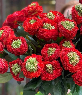 Пишні махрові бутони цієї незвичайної троянди володіють соковитим червоним відтінком. Родзинкою кожної прекрасної квітки виступає яскраво - зелена серединка, яка в оточенні червоних махрових пелюсток виглядає настільки приголомшливо і незвично, що багато хто вважає цей сорт справжнім витвором мистецтва. Діаметр квітки досягає 8-10 см. Висока стійкість до захворювань і дощу.Н: 0,5-0,9 м, d-0,4-0,5 м