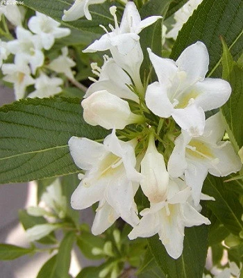 Сорту характерна витончена розкидиста крона і розкішне цвітіння. Особливістю сорту дзвонеподібні сніжно-білі квіти (3-4 см), зібрани у суцвіття по 3-4 шт. Листя велике, світло-зелене. Надає перевагу родючим грунтам, без застою води. Щорічний приріст 20-30 см. Відмінний як солітер в садах, парках, ефектний в якості живоплоту.Н: 1,0-1,2 м, d-1,0-1,2 м