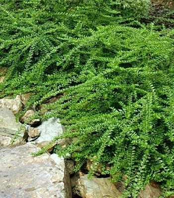 Вічнозелений сорт із розлогими пагонами. Листя вузькоеліптичне, зелене. Квіти кремово-білі, трубчасті, запашні. Плоди дрібні, пурпурно-фіолетові. Віддає перевагу родючим грунтам. Світло-та вологолюбна, але виносить і притінення ділянки. У суворі зими може підмерзати, однак швидко відновлюється. Добре переносить стрижку. Незамінний для рокаріїв, як грунтопокривна рослина, а також чудово виглядає в низьких стрижених огорожах.Н: 0,5 м, d-1,0 м.